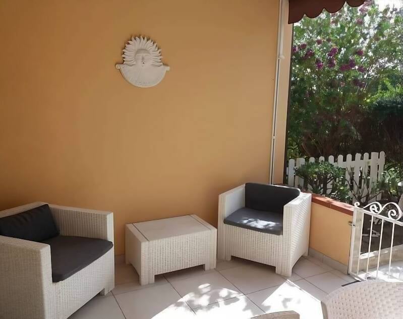 - Covered outdoor terrace, furnished with a table, chairs, and relaxing armchairs